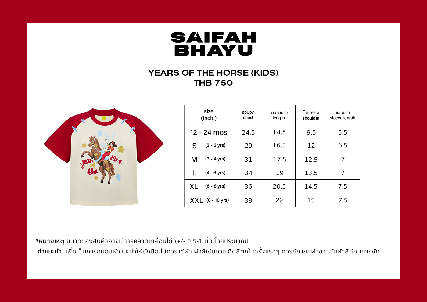 CARE INSTRUCTIONS: เพื่อเป็นการถนอมผ้าแนะนำให้ซักมือ ให้ใช้น้ำยาซักผ้าชนิดอ่อน ไม่ควรแช่ผ้า ไม่ใช้น้ำยาฟอกขาว ผ้าสีเข้มอาจเกิดสีตกในครั้งแรกๆ ควรซักแยกผ้าขาวกับผ้าสี ไม่แนะนำให้อบผ้า ความร้อนจะทำให้ผ้าหด และทำให้รอยพรินต์ หรือรอยสกรีนแตก